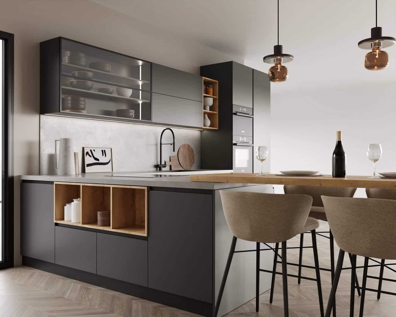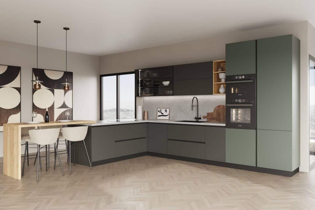 Η κουζίνα ADELE ενσωματώνει τις τελευταίες τάσεις του σύγχρονου design με έναν ζεστό, γήινο χαρακτήρα. Οι ματ αποχρώσεις του πράσινου και του ανθρακί δένουν αρμονικά με τις φυσικές ξύλινες λεπτομέρειες, ενώ ο συνδυασμός με ανοιχτά ράφια και μοντέρνα μαύρα μεταλλικά στοιχεία προσδίδει στυλ και δυναμισμό στον χώρο. Η εντυπωσιακή ξύλινη επέκταση του πάγκου δημιουργεί τραπεζαρία που ενοποιεί την κουζίνα με το καθιστικό. Ιδανική για όσους αναζητούν μία minimal αλλά θερμή κουζίνα με έντονη προσωπικότητα.