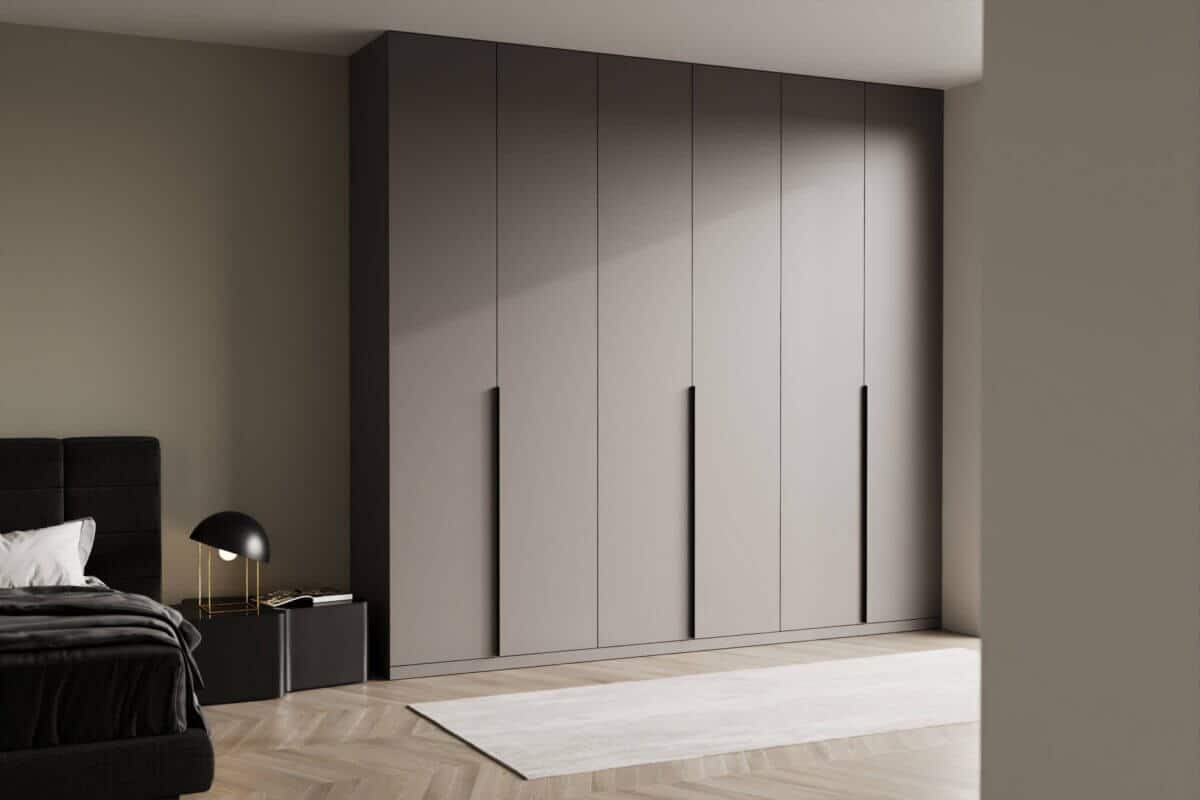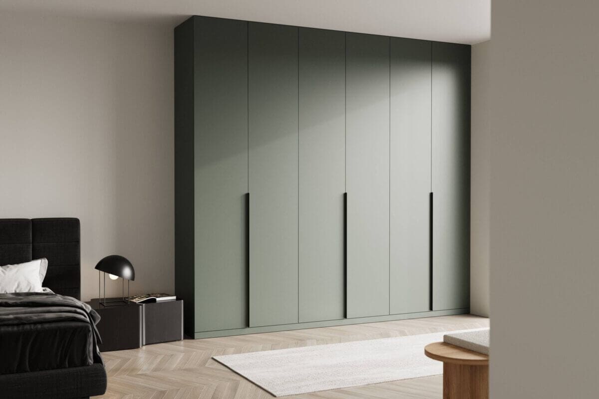 Η πράσινη ματ απόχρωση αυτής της ανοιγόμενης ντουλάπας προσδίδει μια αίσθηση ηρεμίας και κομψότητας στον χώρο, παντρεύοντας το μοντέρνο design με τη φυσική αισθητική. Οι κάθετες μαύρες λαβές δημιουργούν κομψή αντίθεση, αναδεικνύοντας τις καθαρές γεωμετρικές γραμμές του σχεδίου.