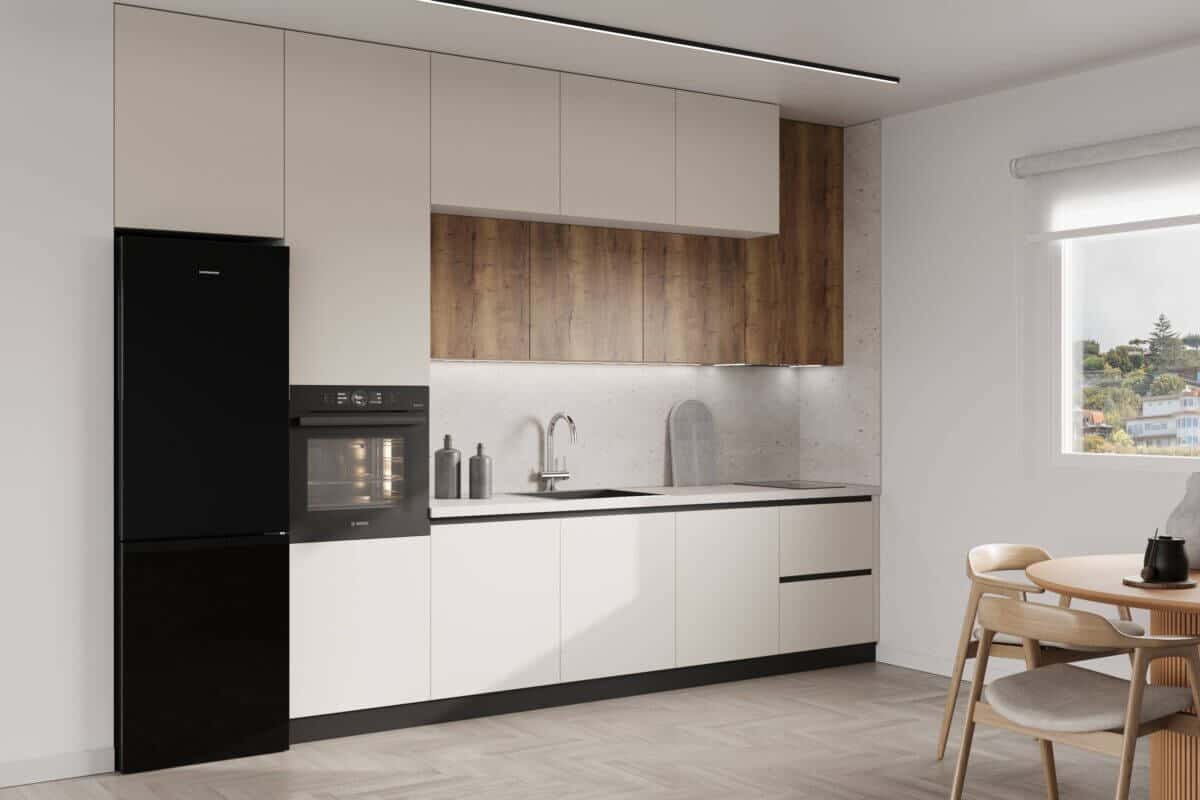 Αυτή η μοντέρνα κουζίνα σε μπεζ και ξύλινες αποχρώσεις σχεδιάστηκε για εξοχική κατοικία στη Χαλκιδική, προσφέροντας απόλυτη ισορροπία ανάμεσα στη λειτουργικότητα και την αισθητική. Οι καθαρές γραμμές, τα άνω ντουλάπια σε φυσικό ξύλο και τα ματ κάτω μέρη σε απόχρωση σαμπανιζέ δημιουργούν έναν ήρεμο και φωτεινό χώρο ιδανικό για καθημερινή χρήση. Η εντοιχισμένη συσκευή και η ελεύθερη διάταξη μεγιστοποιούν την εργονομία, ενώ τα υλικά υψηλής ποιότητας εξασφαλίζουν αντοχή στον χρόνο.