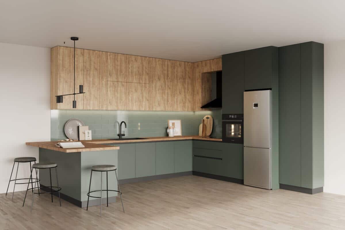 Μια σύγχρονη κουζίνα υψηλής αισθητικής, σχεδιασμένη και κατασκευασμένη από την ομάδα της Adesign Koios. Ο συνδυασμός φυσικού ξύλου και matte πράσινων επιφανειών δημιουργεί ένα κομψό και διαχρονικό αποτέλεσμα που ενσωματώνεται ιδανικά στον χώρο.