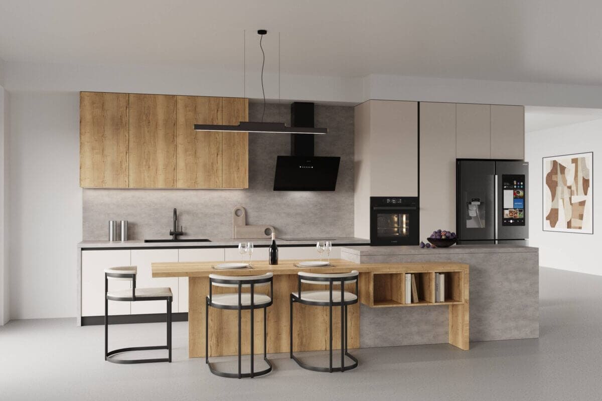 Στην κατοικία στο Πανόραμα Θεσσαλονίκης, σχεδιάσαμε μια κουζίνα που αποπνέει ισορροπία και σύγχρονη κομψότητα. Οι λιτές γραμμές των λευκών και γκρι επιφανειών πλαισιώνονται από φυσικές ξύλινες λεπτομέρειες που προσθέτουν ζεστασιά στον χώρο. Η πρωτοποριακή νησίδα με ενσωματωμένο καθιστικό λειτουργεί τόσο ως τραπέζι πρωινού όσο και ως χώρος αποθήκευσης, καλύπτοντας πλήρως τις καθημερινές ανάγκες μιας οικογένειας.