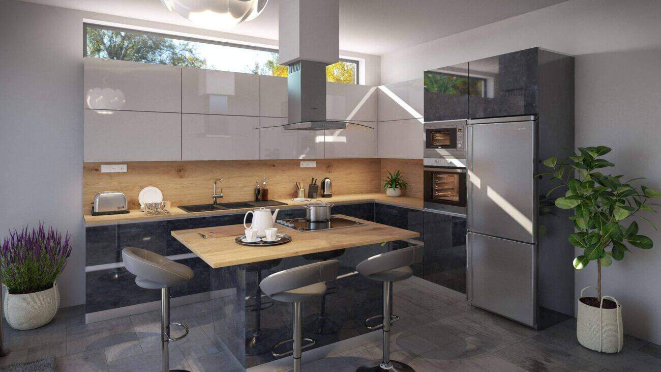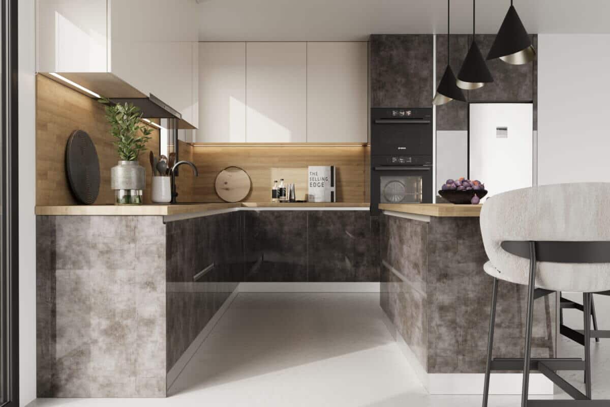 Η κουζίνα LUSSO αποπνέει αίσθηση πολυτέλειας και αρμονίας, με τον τολμηρό συνδυασμό γυαλιστερών επιφανειών σε ανθρακί απόχρωση και φυσικό ξύλο. Οι καθαρές γραμμές, τα εντοιχισμένα ηλεκτρικά και η έξυπνη νησίδα με πάγκο μαγειρέματος και χώρο για καθιστικό προσφέρουν εργονομία και κομψότητα σε κάθε γωνιά. Τα γυαλιστερά ντουλάπια αντανακλούν το φως, φωτίζοντας τον χώρο και δημιουργώντας την αίσθηση μεγαλύτερης κουζίνας.
