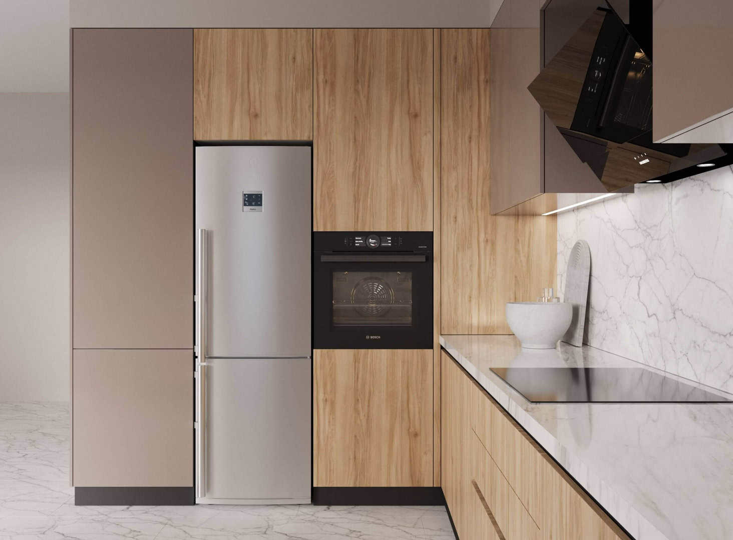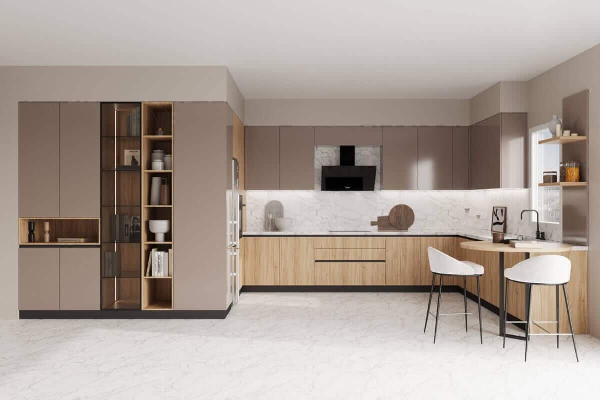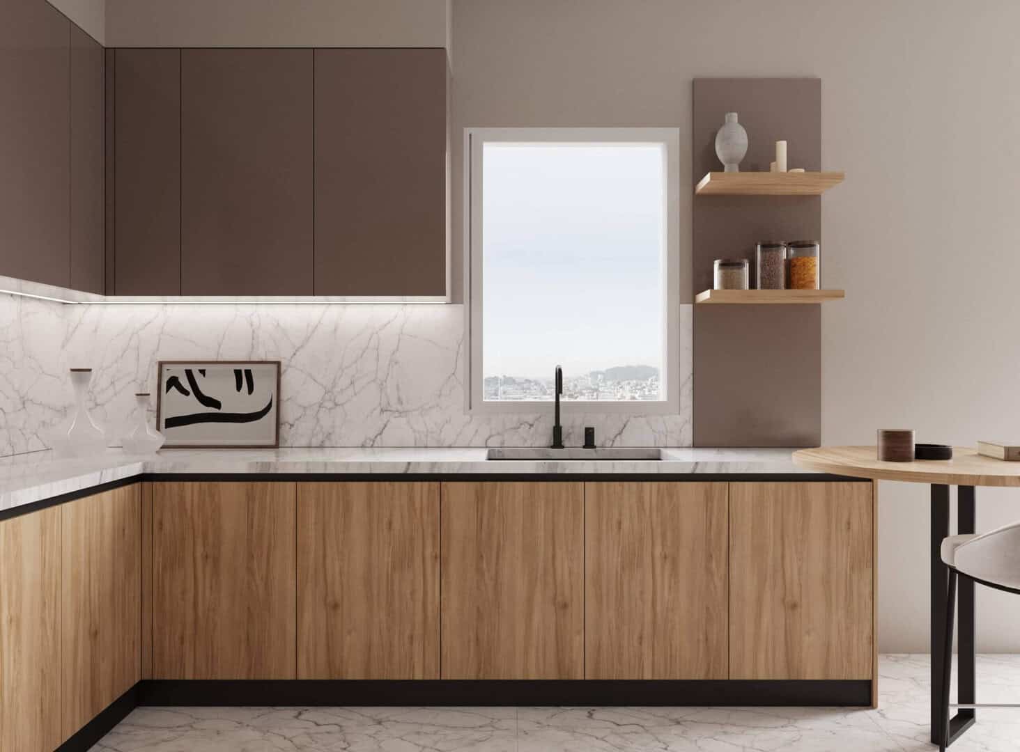 Η κουζίνα MALENA συνδυάζει τη φυσική υφή του ξύλου με γήινους τόνους και marble-look επιφάνειες, δημιουργώντας έναν κομψό και αρμονικό χώρο. Οι γυάλινες βιτρίνες με φωτισμό, οι εντοιχισμένες βιβλιοθήκες και οι καθαρές γραμμές στα ντουλάπια προσφέρουν στυλ και αποθηκευτική ευελιξία. Το ενσωματωμένο μικρό τραπέζι-μπαρ δίπλα στο παράθυρο αποτελεί ιδανικό σημείο για χαλάρωση ή γρήγορα γεύματα. Η MALENA είναι η ιδανική επιλογή για όσους αναζητούν μοντέρνα έπιπλα κουζίνας που αποπνέουν ποιότητα και design.