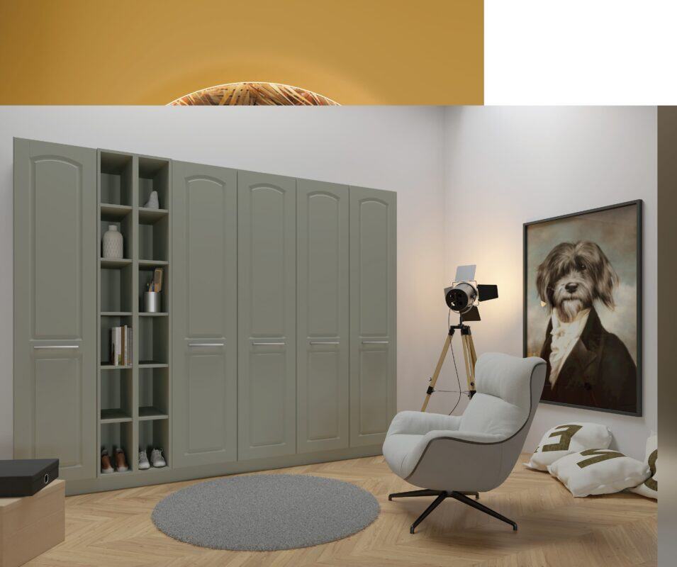 Ανοιγόμενη ντουλάπα σε κλασικό ύφος με διακοσμητικά ταμπλαδωτά φύλλα και ενσωματωμένη ανοιχτή βιβλιοθήκη στο πλάι, που προσθέτει πρακτικότητα και διακοσμητικό χαρακτήρα. Ο συνδυασμός κλειστών αποθηκευτικών χώρων και ανοιχτών ραφιών δημιουργεί μια ισορροπημένη λύση για οργάνωση και προβολή αντικειμένων στον ίδιο όγκο.