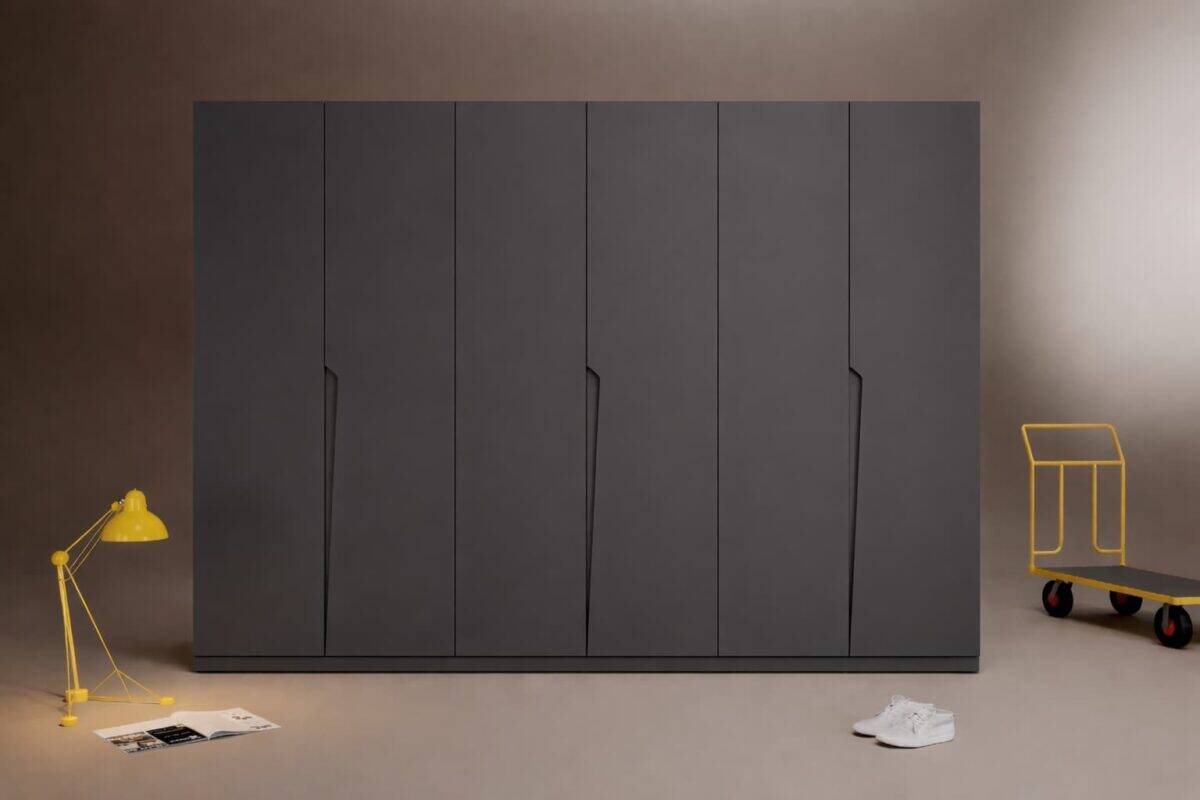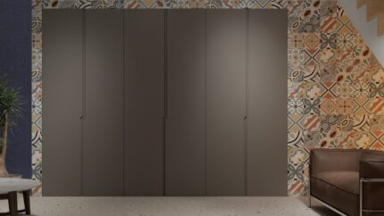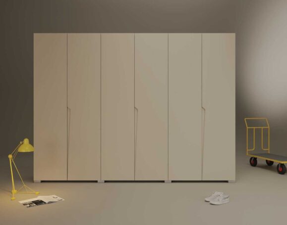 Ανοιγόμενη ντουλάπα με καθαρές, επίπεδες επιφάνειες και ενσωματωμένες χούφτες (σκαμμένες λαβές) που δημιουργούν ένα απόλυτα minimal και ενιαίο αποτέλεσμα. Ο σχεδιασμός χωρίς εξωτερικά πόμολα τονίζει τη γεωμετρία των φύλλων και προσφέρει άνετο, εργονομικό άνοιγμα με διακριτικό τρόπο.