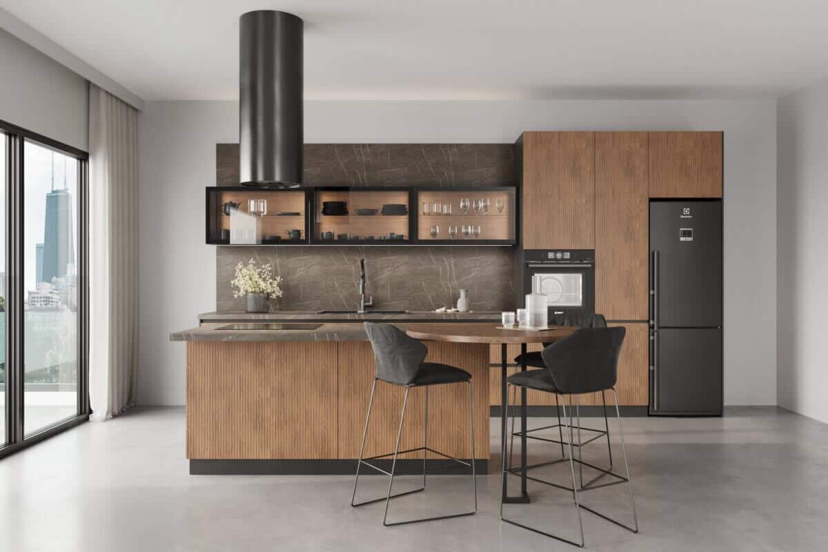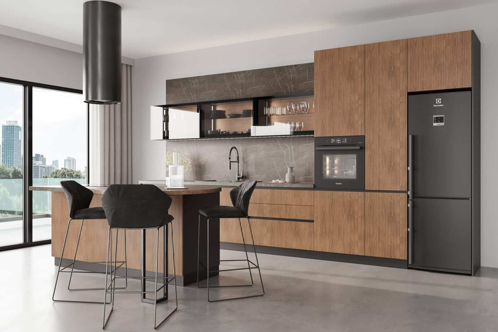 Η κουζίνα RIGA συνδυάζει κάθετα ανάγλυφα ντουλάπια σε φυσική απόχρωση ξύλου με μαύρες ματ λεπτομέρειες και επιφάνειες πέτρας, δημιουργώντας μια statement αισθητική που τραβάει τα βλέμματα. Ο τοίχος με γυάλινες βιτρίνες και εσωτερικό φωτισμό προσφέρει εκλεπτυσμένη αποθήκευση, ενώ η επιβλητική νησίδα με κάθετες νεράδες ξύλου και μοντέρνα σκαμπό μεταμορφώνει τον χώρο σε κέντρο συγκέντρωσης. Ιδανική για όσους αναζητούν premium μοντέρνα κουζίνα με στιβαρό design και σύγχρονη λειτουργικότητα.